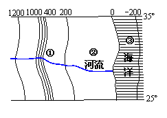 右图为纬度为25º-30º间等高(深)线图(单位:m),读图回答5-7题。