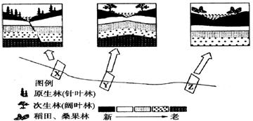 右图为我国某地区一条河流不同河段的X、Y、Z三处截面上的剖面图及其所在地区的典型植被分布图。据图回答7-8题。