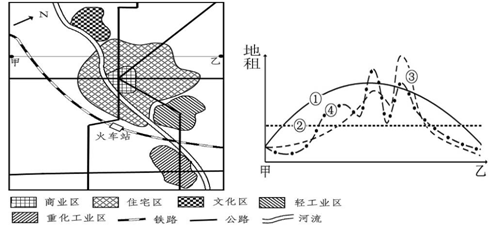 某城市地处平原地区,下左图示意该城市功能分区,下右图示意该城市的地租变化。读图回答第7-8题。