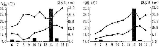 下图2009年4月6-15日东部某省同纬度沿海某地和内陆某地日最高气温、最低气温和降水量分布。读图回答9-10题。