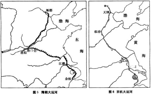 (2)比较图5和图6,从隋运河到今天的京杭大运河,运河的哪些河段有显著的