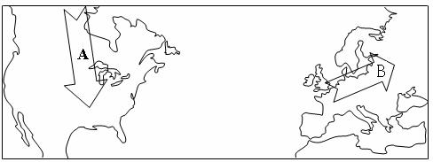 (4)联系图中两地的海上通道叫北大西洋航线,造成该航线的不安全自然因素有哪些?近年来世界局部地区海上航线频繁遭遇海盗,你认为这条航线未来是否也可能遭遇海盗?并说明理由。(8分)