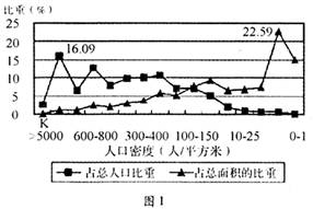 图1是我国基于密度分级的人口----面积比重图,完成1-2题。