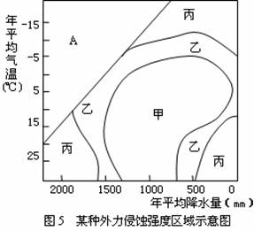 气候是地貌形成的重要因素之一。在1950年,著名地理学家Peltier根据全球各地不同的气候条件,划分出大、中、小三种不同的某种外力侵蚀强度区域(图4),其中甲、乙、丙分别代表大、中、小三种侵蚀强度区域,其中对A区域不作该外力作用强度的划分。读图4回答5-6题。