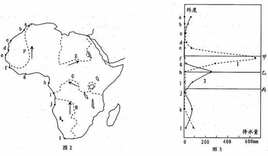 图2中a一1表示非洲西海岸地带的城市。图3中折线1、2表示这些城市1月与7月的降水量分布,甲、乙和丙中的某一条直线表示赤道。据此回答7-8题。