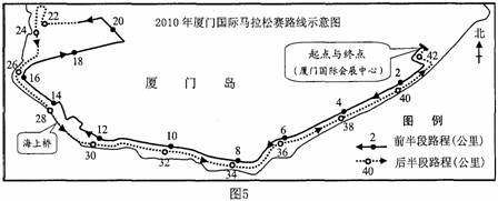 经国家体育总局批准,2010年厦门(北纬24°27′,东经118°06′)国际马拉松赛事于北京时间1月2日上午8点鸣枪开赛。图5为2010年厦门国际马拉松赛路线示意图,图6为某女运动员比赛过程即时素描图。当该女运动员到达全程赛事终点时,她的身影向正北并大致与身高相等。据此完成9-11题。