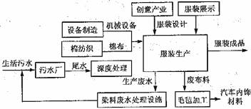 温家宝总理在2010年3月5日举行的十一届全国人大三次会议上指出,要积极发展循环经济和节能环保产业。下图为某市服装产业集聚地循环经济产业链。读图完成27~28。