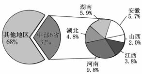 下图为2005年我国中部六省粮食生产占全国比重状况图,读图回答7-8题。