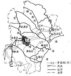 (1)当海平面上升0.3米时,在不加防护的情况下,遇到特大天文潮位时,天津市被淹没的区县主要是 ,届时后果将不堪设想。此外,冷冬年份的 灾害,也会给海上运输和海洋渔业生产造成损失。(6分)