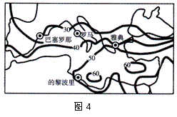 图4示意地中海地区冬雨率等值线分布(冬雨率为冬季降水量占全年降水量的百分率,单位:%)。读图,回答7-8题。