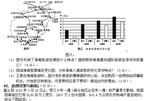 2010年1月4日,国务院发布了《关于推进海南国际旅游岛建设发展的若干意见》,将海南建设成国际旅游岛上升为国家战略,为海南旅游发展提供了新的机遇。结合下图的海南岛旅游图,回答下列问题。