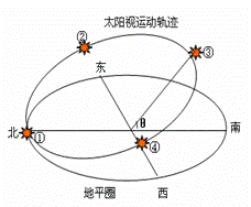 右图为某地在一天中所看到的太阳运动轨迹,当太阳运动至③位置时,太阳高度(θ为42°)达一天中最大,此时北京时间为14时。读图回答1-2题。