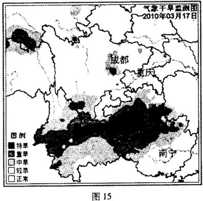 读气象干旱监测图(图15),回答下列问题。