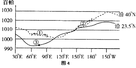 图4 是某月份海平面平均气压沿两条纬线的变化图,回答5-6题。