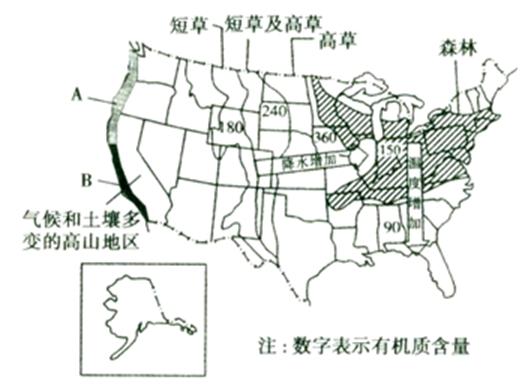 (2)分析美国大陆中部、东部土壤中有机质含量多少的分布规律,并分析其成因。(12分)