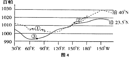 图4 是某月份海平面平均气压沿两条纬线的变化图,回答5-6题。