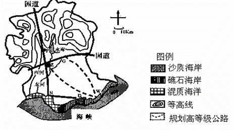 图为某地级市的市城城镇体系规划示意图。该市沿海有N、D、W三个县城。东邻海岸为沙质岸线,沙软潮平,水质清流,附近有海岛;中部主要为礁石海岸,距海岸500m处水深可达20-25m;西部沿海有大面积的盐田。读后完成9-11题。