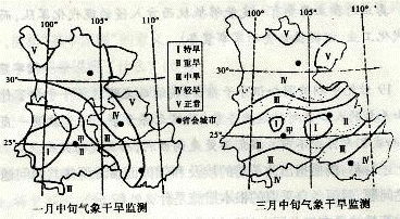 材料一 2010年1月中旬和3月中旬我国某区域干旱等级分布图。