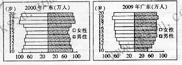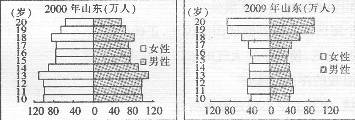 18~20岁是高考适龄人口。读广东省和山东省2000年和2009年10岁至20岁的人口金