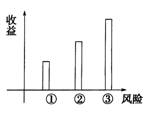 某公民把自己的闲置资金用于投资,共选择了股票、金融债券和储蓄存款三种投资方式。右边柱形图是对这三种投资方式特点的描述,①、②、③应分别是( )