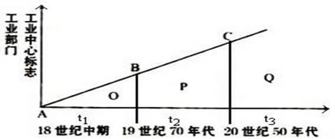 读下面的工业发展过程示意图,t1、t2、t3为三个发展阶段,A、B、C为三次技术革命的标志,O、P、Q为工业中心及工业部门。完成10-11题。