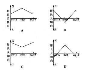 下列图示中,能正确表示天安门广场旗杆正午杆影在一年中的影长及朝向变化的是
