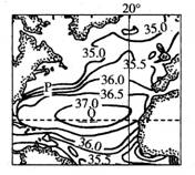 读某大洋8月海洋表面盐度分布图(单位:%。)。回答10-12题。