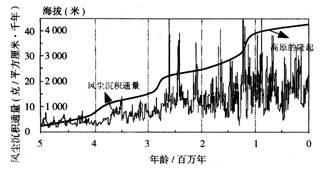 风尘沉积通量大小可以指示地区干燥度的变化。下图反映了青藏高原隆起与西北地区的风尘沉积通量变化情况。读图回答15-18题。