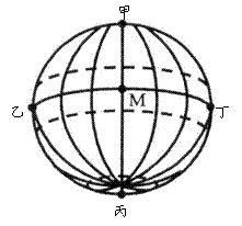 下图中,甲、乙、丙、丁位于晨昏圈上、且相隔90°,地球位于远日点附近。读图,完成5-6题。