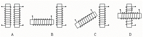 26.在无线电仪器中,常需要在距离较近处安装两个线圈,并要求当一个线圈中有电流变化时,对另一个线圈中的电流的影响尽量小。则下图中两个线圈的相对安装位置最符合该要求的是