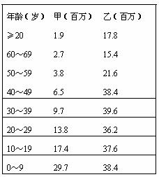 40.根据表中甲、乙两个国家各年龄段的人口数量统计数据,判断下列叙述正确的是