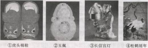 ①虎头棉鞋 ②玉佩 ③长信宫灯 ④松鹤延年