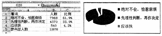 来,还有人“善意”地提醒:“别去扶他,当心赖上你,到时后悔都来不及。”某论坛网友“蟋蟀”也参与了救助,并用相机拍下了救助全过程。“蟋蟀”说,他和朋友在附近逛街,看见老人突然倒下,身体不停地抖,朋友就帮老人翻了个身,让老人不要起来,然后拨打了急救电话。扶,还是不该扶?近13万名网友参与了某网站发起的投票。结果,61.9%的网友选择了“绝对不会,怕惹麻烦”,33.9%的网友认为,应该“先理性判断,再作决定”。仅有4.2%的网友觉得,肯定应该扶老人,认为“这是起码的公德”。