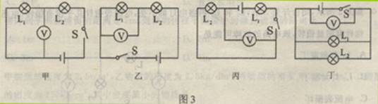 14、在图3所示的四个电路中,当闭合开关S后,小灯泡L1、L2都能正常发光,其中电压表可直接测出L1两端电压的电路图是