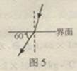 19、一束光线从玻璃射向空气,如图5所示。则折射角为__________。