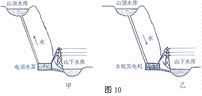 17、(2005广州市)核电站一旦工作,就不能随意停下来,而电网白天用电量多,深夜用电量少,为了使核电站稳定工作,建设了抽水蓄能电站.深夜,电动水泵将山下水库的水抽到山顶水库,如图10甲所示,白天用电高峰时,再把山顶水库的水放下来推动水轮机发电,如图10乙所示.请分析深夜和白天抽水蓄能电站工作过程中包含哪些能量的转化过程.