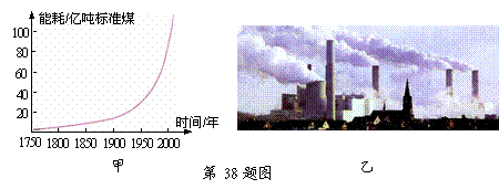 25、(2005浙江省)能源是人类社会存在和繁荣的物质基础之一,图甲为近两个多世纪以来,人类能源消耗曲线图,图乙为某燃煤电厂全景图。据图回答: