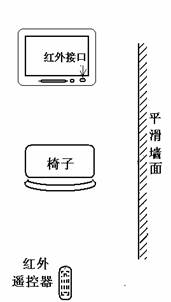 19.电视机的遥控器是利用红外线传递信息对电视机进行遥控的。一次小黄坐的位置与电视机红外线接收窗口之间刚好有张椅子挡住视线,如图9所示。小黄利用光的反射,将遥控器对准房间光滑的墙壁按动遥控器达到了遥控的目的,请你利用光的反射定律,在图中画出遥控器发出红外线传播到电视机红外线接收窗口途径(红外线反射线路)。