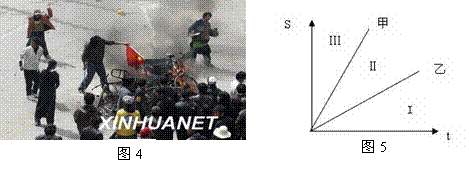 7. 某课外小组进行自制玩具赛车20m跑比赛.甲、乙、丙、丁四辆赛车同时从起点出发,假设它们均做匀速直线运动,结果最先到达终点的是丙车,最后到达终点的是丁车.若甲、乙两车的路程和时间的s-t 图象如图5所示,则关于丙、丁两车的s-t图象所在的区域,下列说法中正确的是