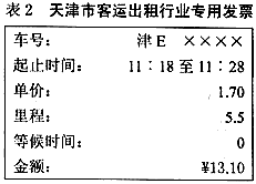 19.某人乘出租车时得到一张天津市客运出租行业专用发票,如表2所示,此人乘车所乘车时间为 :该车“这段时间内运动的平均速度为 km/h