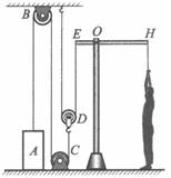 如图是一个上肢力量健身器示意图。配重A受到的重力为1200N,其底面积为5×10-2m2. B、C都是定滑轮,D是动滑轮;杠杆EH可绕O点在竖直平面内转动,OE:0H=2:5。小成受到的重力为600N,他通过细绳在H点施加竖直向下的拉力为T1时,杠杆在水平位置平衡,小成对地面的压力为F1,配重A受到的拉力为FA1,配重A对地面的P1为6×103pa。小成在H点施加竖直向下的拉力为T2时,杠杆仍在水平位置平衡,小成对地面的压力为F2,配重A受到的拉力为FA2,配重A对地面的压强P2为4×103pa。已知F1:F2=20:19,杠杆EH和细绳的质量均忽略不计。求(1)拉力FA2;(2)拉力T2;(3)动滑轮D受到的重力G。