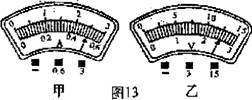 (3)实验持续了10 min,实验中每次测得的灯泡两瑞的电压U和通过灯泡的电流I记录在下表里,其中第5次测得的电流I5和第6次测得的电压U6分别如图13中甲和乙所示,请在此表的空格内填人相应的数据。