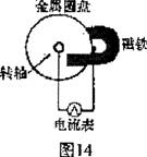 22.图14是某课外活动小组仿制的一个能产生持续电流的装置-发电机,装有手摇柄(未画出)的转轴垂直穿过圆盘中心,金属圆盘放在蹄形磁铁之间,圆盘的轴心和能在圆盘的边缘滑动接触的滑片通过金属导线与电流表相连。金属圆盘可以看成是由无数根长度等于圆盘半径的导线组成的,圆盘在磁极间不断转动,每根导线都在做切割磁力线的运动,从而产生持续电流。当以某一转速匀速转动金属圆盘时,电流表有一定的计数。