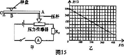 24.某电子磅秤原理图如图15(甲)所示,主要部件是杠杆ABO,电流表A和压力传感器(相当于电阻值会随受到的压力大小发生变化的可变电阻),其中杠杆可绕O点转动,且力臂之比AO:BO=5:1,压力传感器的电阻值R随所受到的压力F的关系图像如图15(乙)所示,秤盘与杠杆质量均忽略不计,电源电压9V,R0=60Ω,(取g=10N/kg)。求: