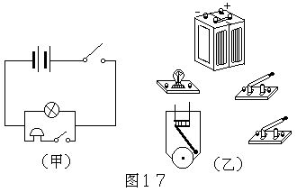 59、按照图17(甲)所示的电路图,将图17(乙)中各元件连接起来。(用笔画线表示导线,导线不许交叉)(1分)