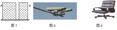 12.如图7所示,A,B为两个等高等质量的圆柱形容器,容器内部都装满水.水对容器底部的压强PA PB,容器对桌面压力FA FB。(填“>”、 “=”或 “<”)