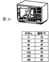 30.小李同学要测量一微波炉的加热效率。他把微波炉的输入功率调在最大的600W,将装有0.2kg水的透明塑料杯放入炉中,如图20所示,小李开启微波炉后,利用微波炉的温度探头每30s测量一次水温,并将结果记录在表中。求: