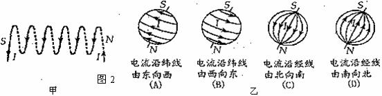 2.根据通电螺线管周围存在磁场(如图2甲)的实验事实,某同学对地磁场产生的原因提出了一个假说:地磁场是由绕地球的环形电流引起的。下图2乙中符合他假说的模型是