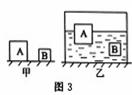 质量相同的两个实心正方体A和B,如图3-甲所示,将它们放在水平地面上时,它们对地面产生的压强PA PB。当将它们放入水中后分别静止在如图3-乙所示的位置,则它们受到水的浮力FA FB(填“大于”“等于”或“小于”)。