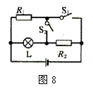 图8中的电源电压为6V,且保持不变,电阻R1=R2=12W,灯L标有“6V,3W”。当开关S1、S2闭合时,下面说法中正确的是( )